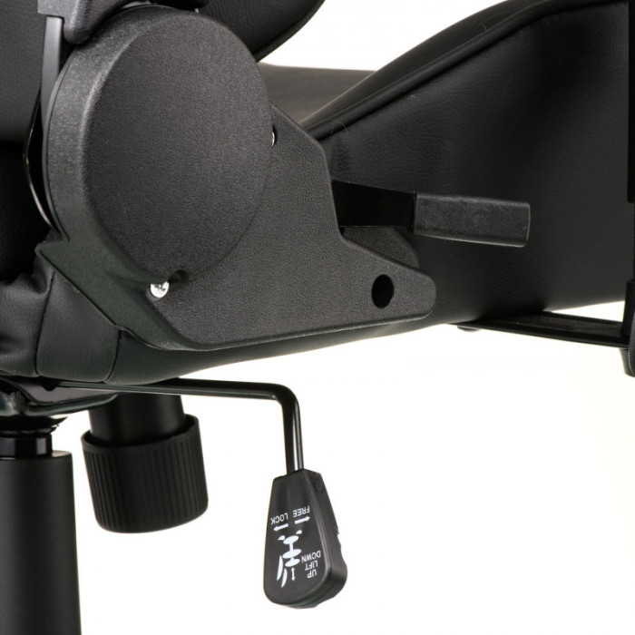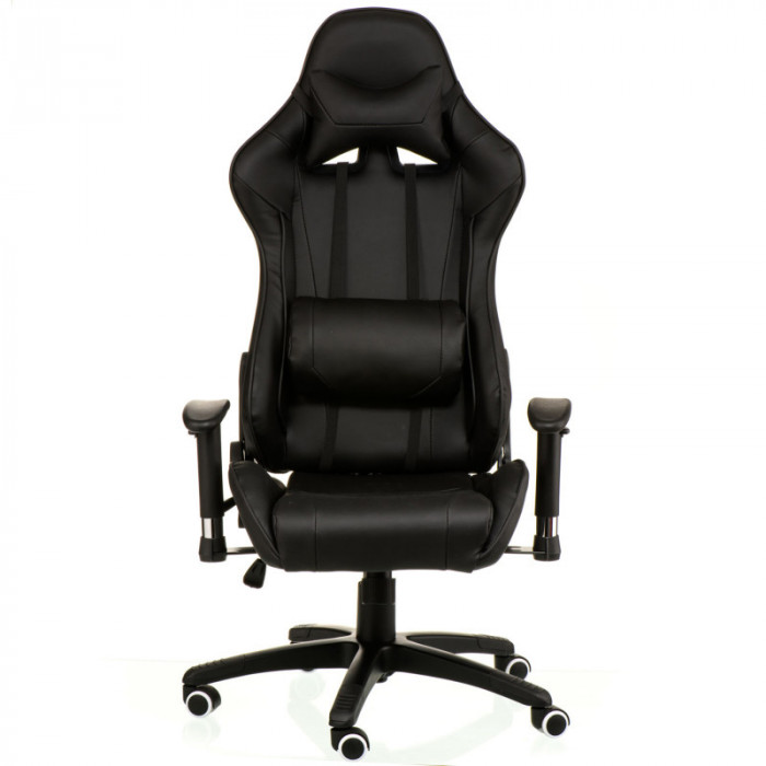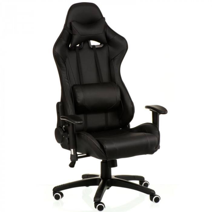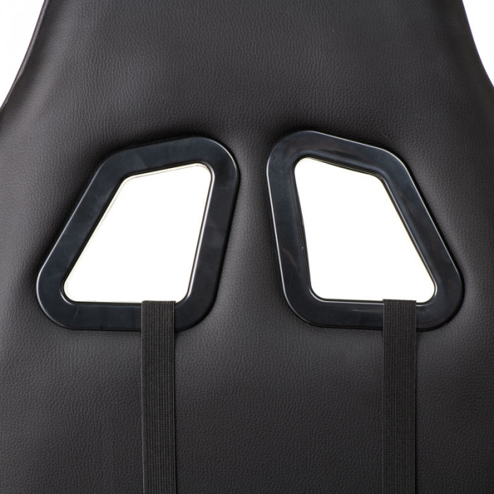 Крісло ExtremeRace black/black має ультрасучасний дизайн. Стиль цієї моделі підійде не лише любителям комп’ютерних ігор, але і може оживити домашню атмосферу і робочий кабінет. Крісло має високу спинку, в якій застосовується цікаве дизайнерське рішення із двома симетричними отворами в області лопаток та регулюючим м'яким підголівником. Пластикові підлокітники, з можливістю регулювання по висоті Т-подібної форми, надають кріслу оригінального стилю. Ергономічна форма спинки, яка фіксується під різними кутами, дозволяє спертися і розвантажити не тільки спину, але і шию, і частково плечі, що необхідно при тривалій роботі. Доповненням повноцінного комфорту є зручна регульована подушка під поперек. Регулювання крісла по висоті дозволяє підняти або опустити сидіння на потрібний рівень для правильної посадки, при якій коліна повинні бути зігнуті під прямим кутом, ступні торкатися підлоги. Режим гойдання крісла заспокоює нервову систему, усуває статичне навантаження на м'язи і хребет, що безсумнівно є корисним для здоров'я. Каркас крісла міцний і витримує навантаження до 150 кг.